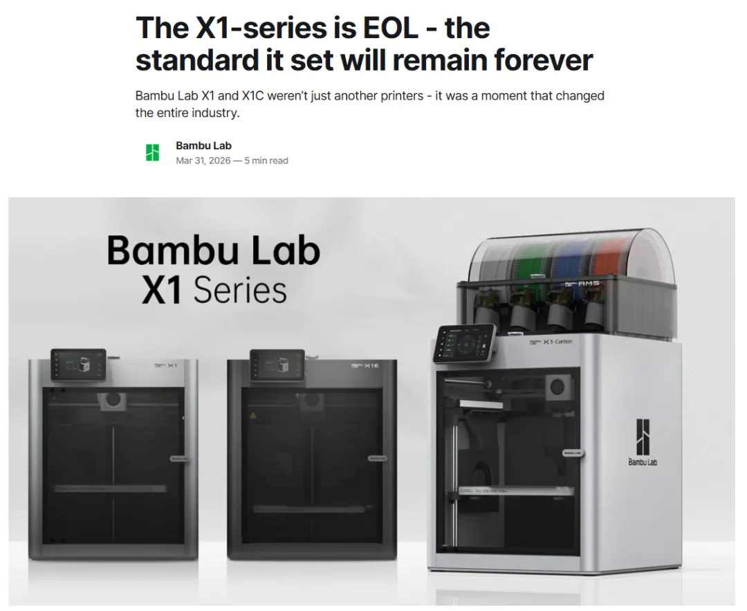 2026年3月31日,消费级3D打印爆发背景下,拓竹的第一代旗舰机,X1C,正式停产。