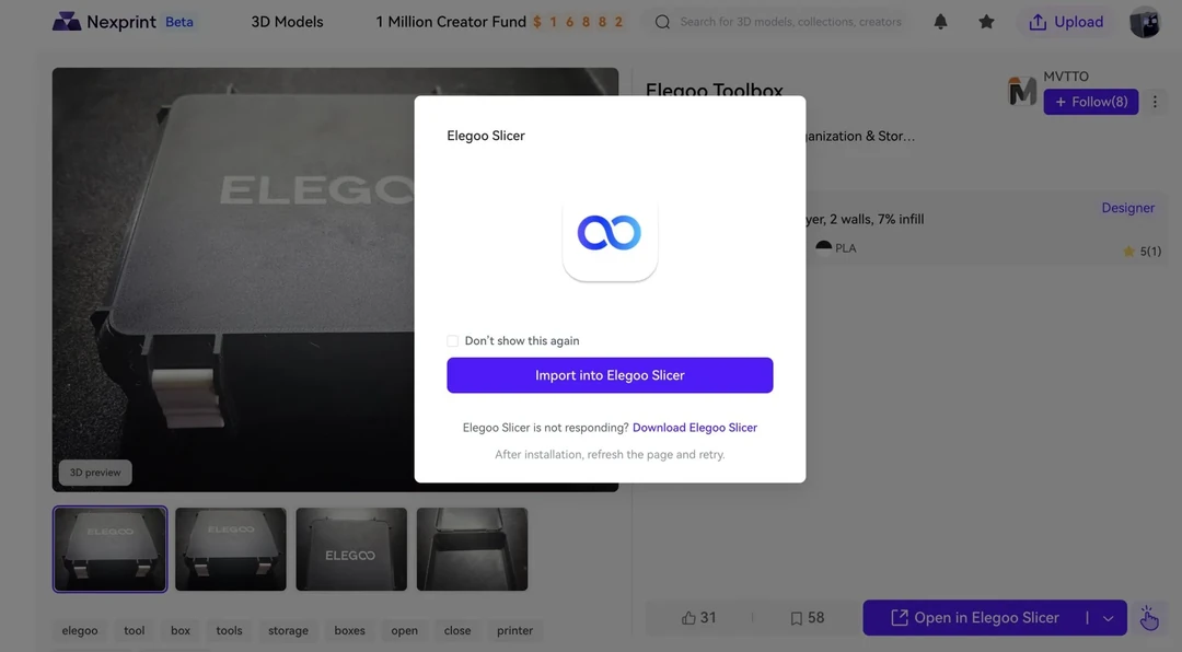 它与ElegooSlicer集成,确保从模型选择到使用市场上大多数3D打印机进行打印的工作流程顺畅,并聚合了来自Nexprint以外平台的3D模型。
