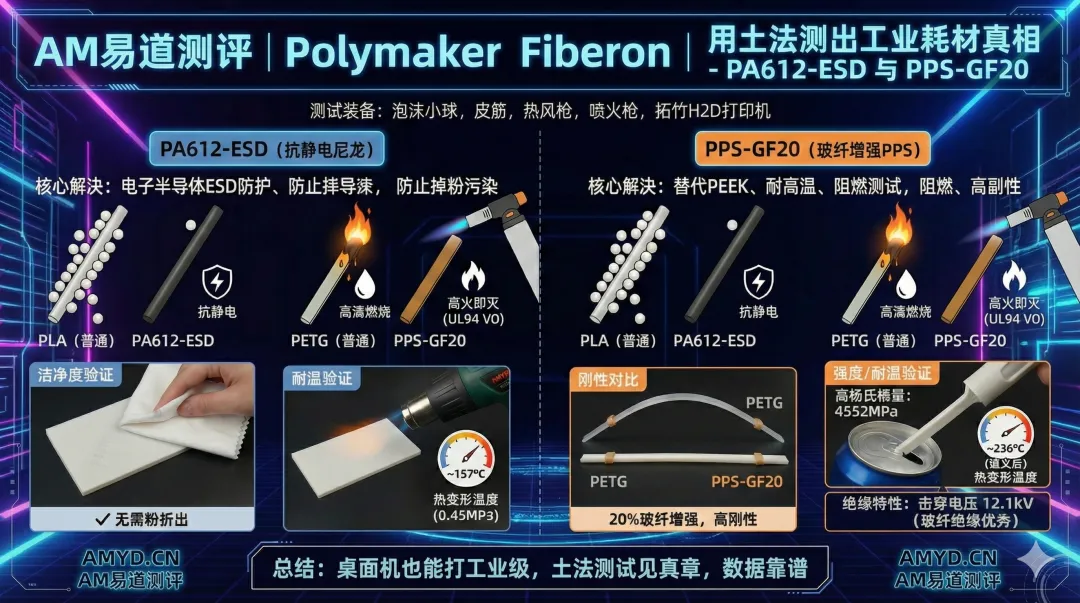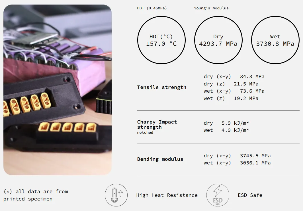 现在三四千的桌面机配合几十美元的Fiberon耗材,就能打出热变形温度超230℃、UL94 V0阻燃的零件,或者打出不掉粉、耐157℃的ESD零件。