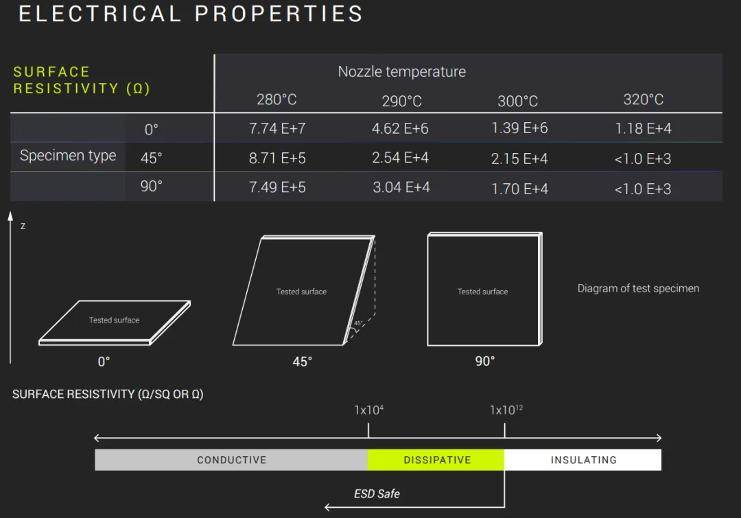 Polymaker的解法是碳纳米管配合10%碳纤维,表面电阻稳定在10⁴–10⁷ Ω/sq。