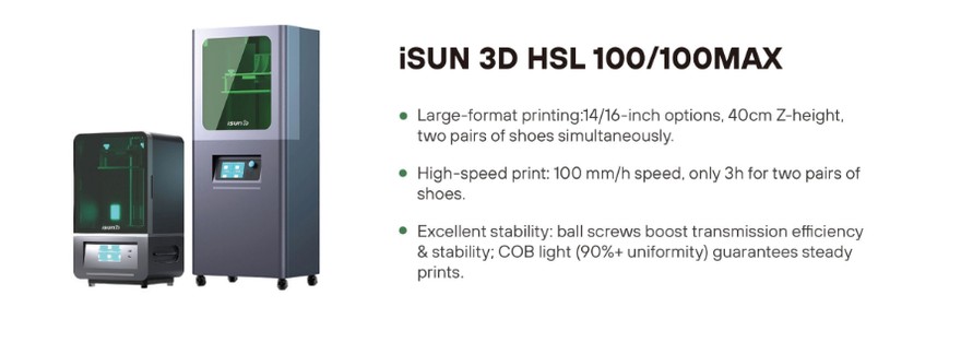 配套设备iSUN3D HSL 100/100MAX光固化3D打印机提供14寸与16寸打印幅面,尺寸达353*198*400mm,搭载低离型力技术实现80-150mm/h高速打印。