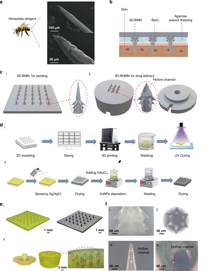 该敷料采用了两种高分辨率3D打印微针结构:实心微针用于测量组织阻抗,空心微针则用于输送药物。微针设计借鉴蜜蜂刺的结构,带有微型倒刺,可确保在长期使用时保持稳定附着。