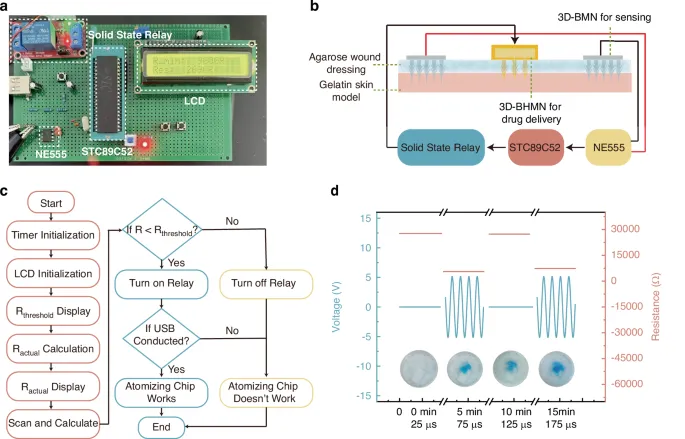 组织阻抗的变化可反映伤口湿度、炎症或感染程度。研究团队在传感微针表面涂覆银、氯化金和纳米金颗粒层,以提高信号的稳定性和可重复性。当阻抗值低于设定阈值时,系统会自动激活超声波雾化器,将药物通过空心微针精准输送至伤口部位。
