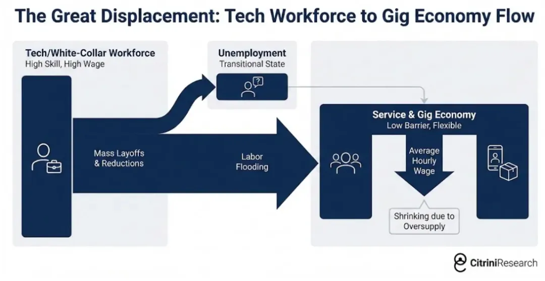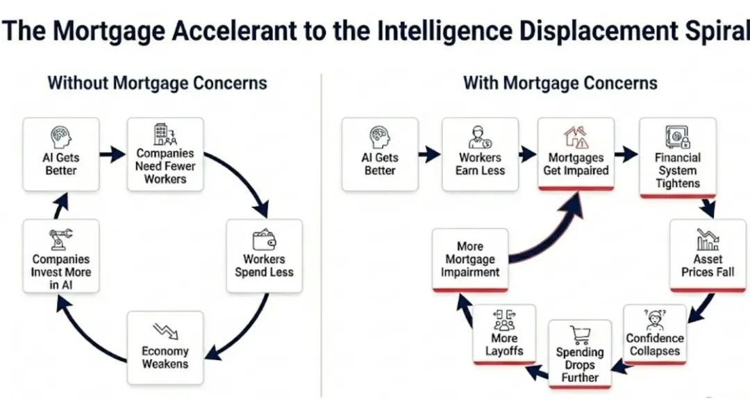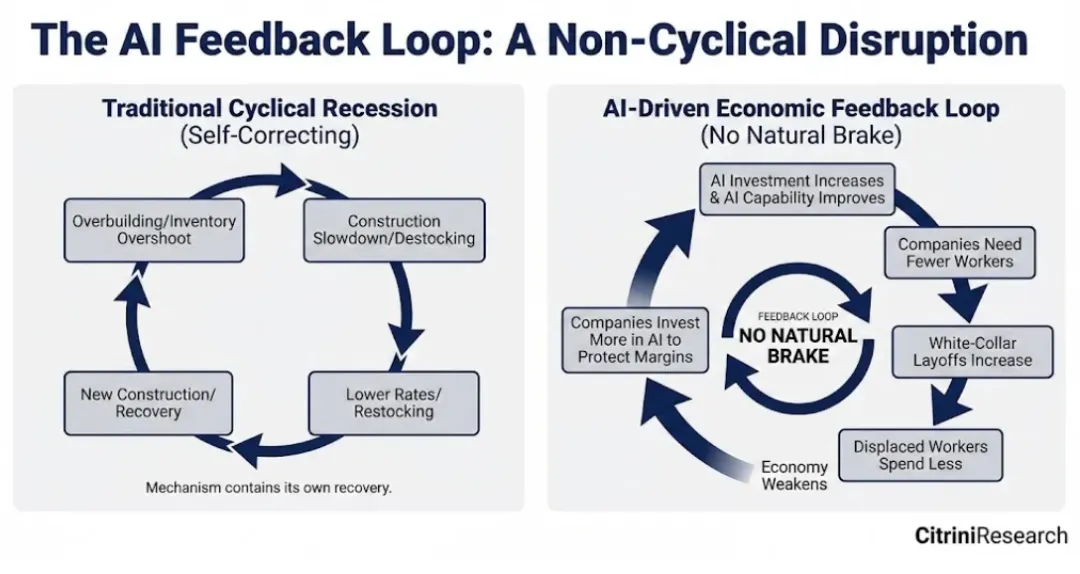 当这件事大规模发生,连锁反应是:白领收入下降→消费减少→企业营收承压→继续裁员买AI→循环加速。