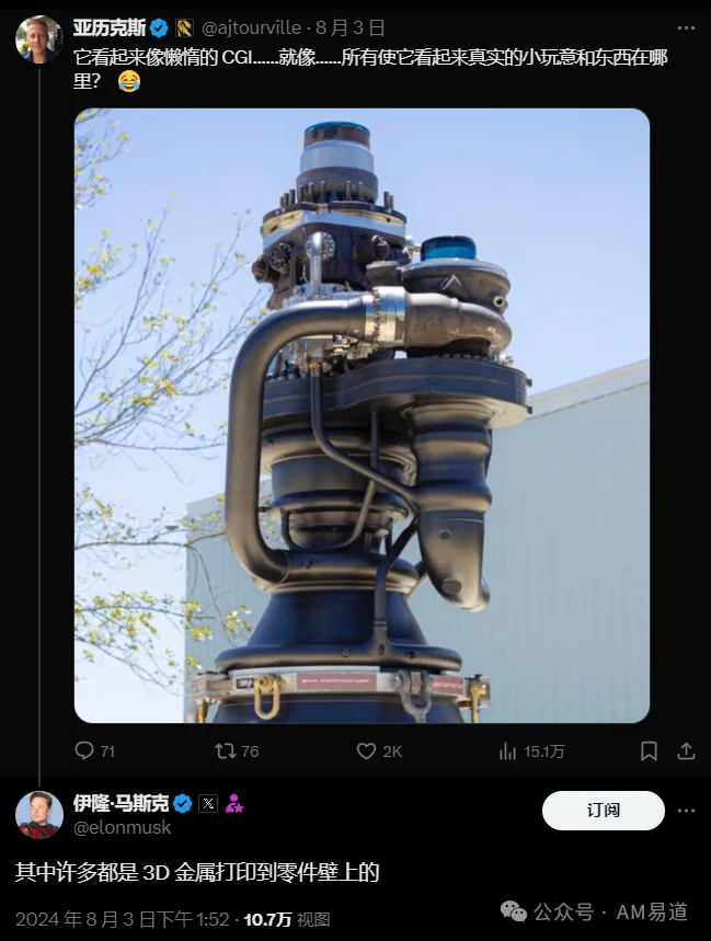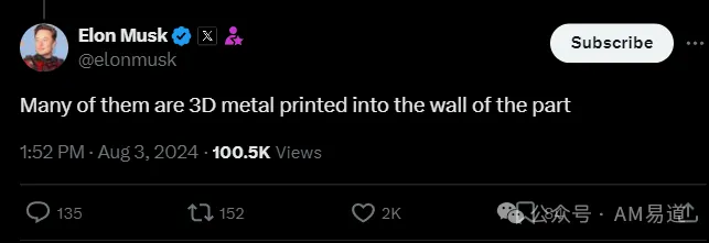 马斯克一语惊醒梦中人,许多零件(连接件、冷却、管道)是金属3D打印的!