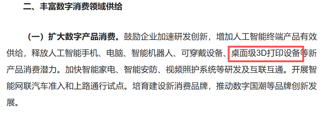 在《关于大力发展数字消费共创数字时代美好生活的指导意见》中,桌面级3D打印设备被明确纳入国家数字消费重点发展领域,与人工智能手机、电脑、智能机器人并列成为"释放消费潜力"的新产品类别。