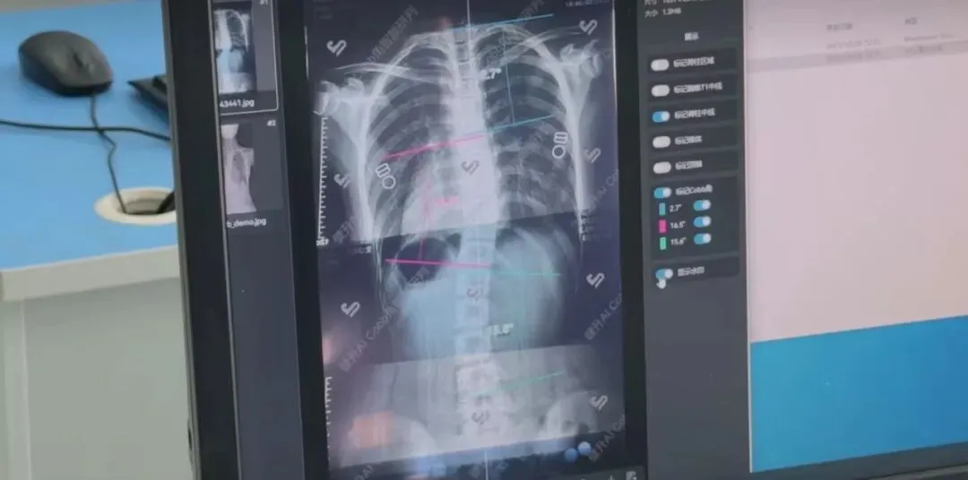 扫描模型与X光片在软件中结合,AI小程序直接计算Cobb角、标记顶椎位置,确定压力点主位。
