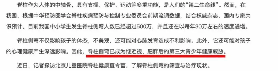 据中国青年报报道,我国中小学生脊柱侧弯人数已超过500万,每年新增约30万人,是继近视、肥胖之后青少年第三大健康威胁。