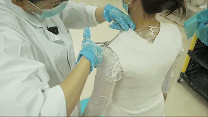 用石膏绷带裹住患者上半身取出阴形,灌石膏得到阳形,技师手工修型,再用PP板或PE板热塑贴附成形。