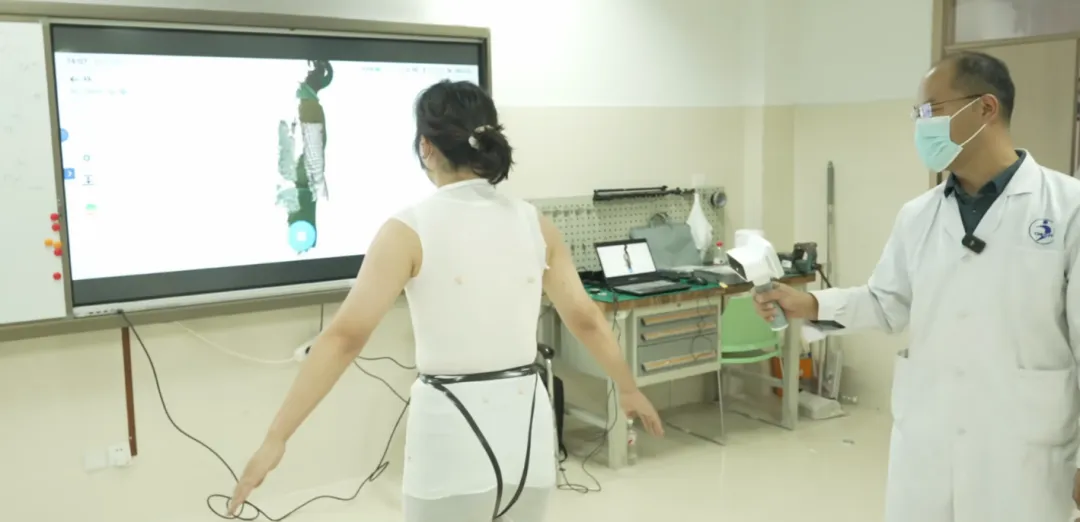 扫描环节。 矫形师用手持3D扫描仪对患者躯干扫描,全程约1分钟,无接触,患者扫描完即可离开。