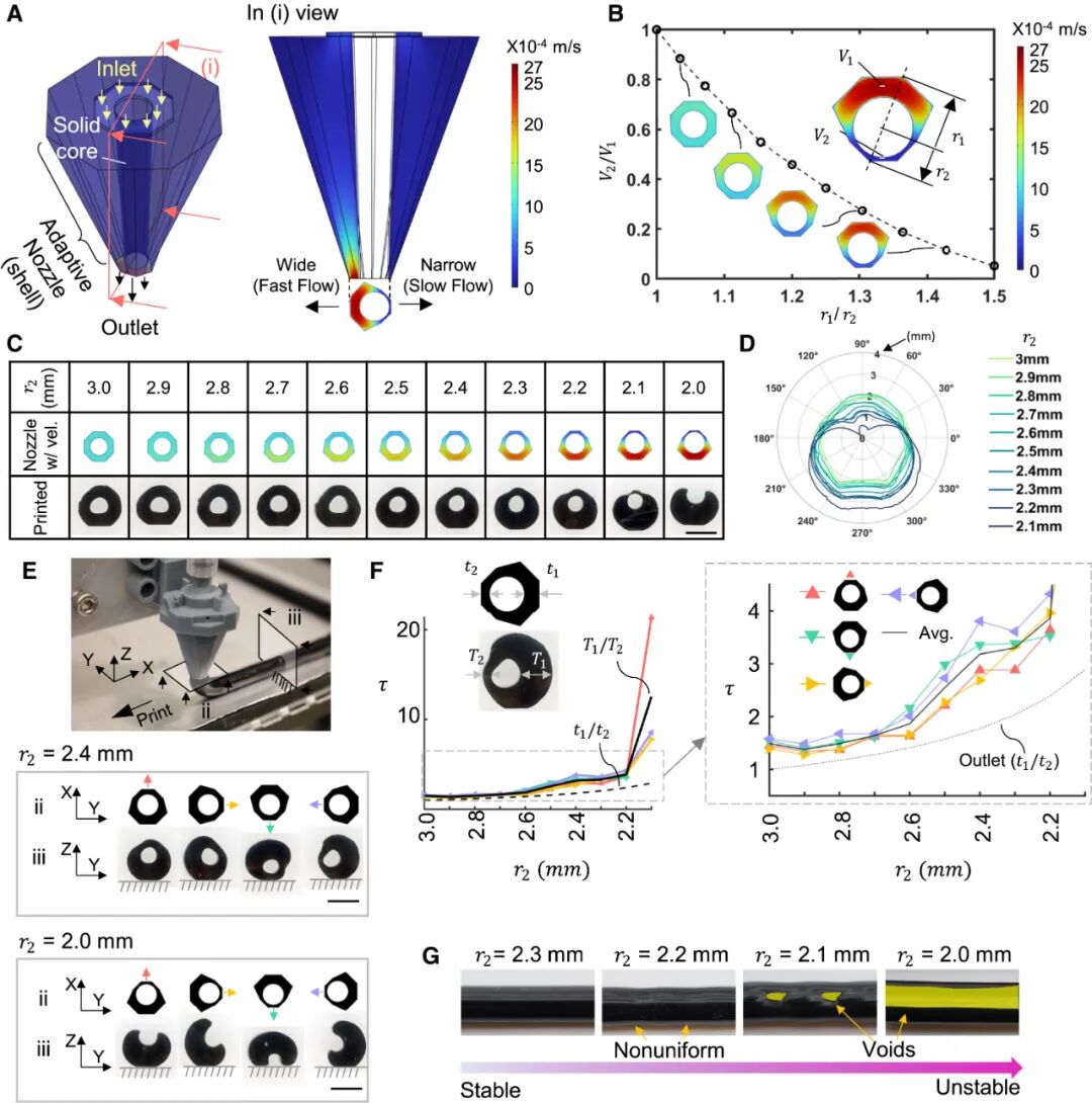 用一个能实时变形的同轴喷嘴,一步打印出壁厚沿周向连续变化的中空纤维。