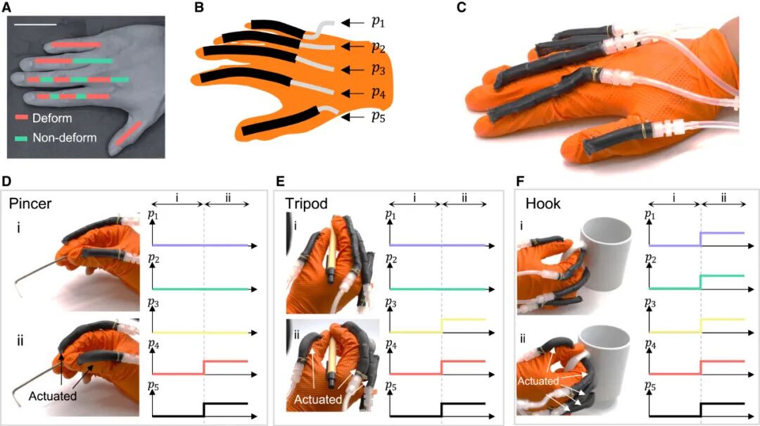 五路独立气压控制实现了不同抓握模式—捏握(p4、p5)、三指握(p3、p4、p5)、钩握(p1到p5)。