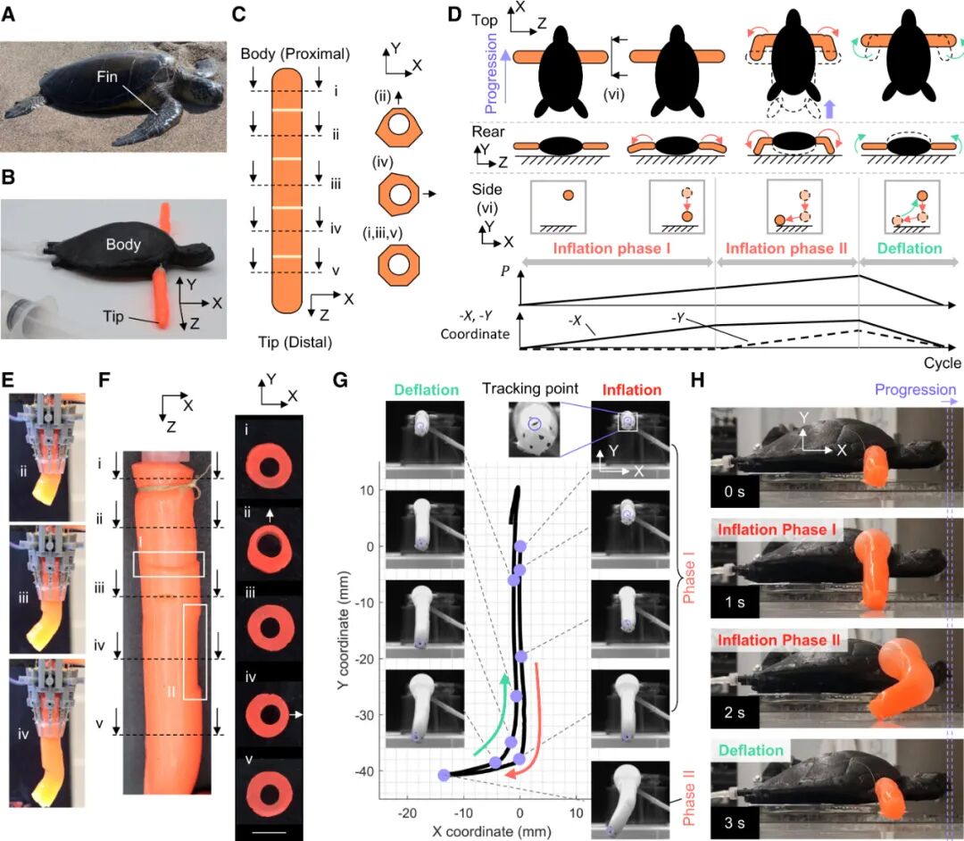 看D图的时序分解:气压刚上来时,壁厚差大的ii段先弯,鳍肢抬起;气压继续升高,壁厚差小的iv段才开始弯,鳍肢向前推。