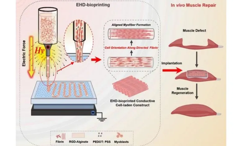 这项研究旨在攻克再生医学中的一个核心挑战。传统生物打印技术虽能复制肌肉组织的外部形状,但结构内部的细胞通常处于无序状态。这种无序性导致细胞无法融合成具有功能的肌纤维,也难以有效收缩,最终使得打印出的组织机械性能薄弱。