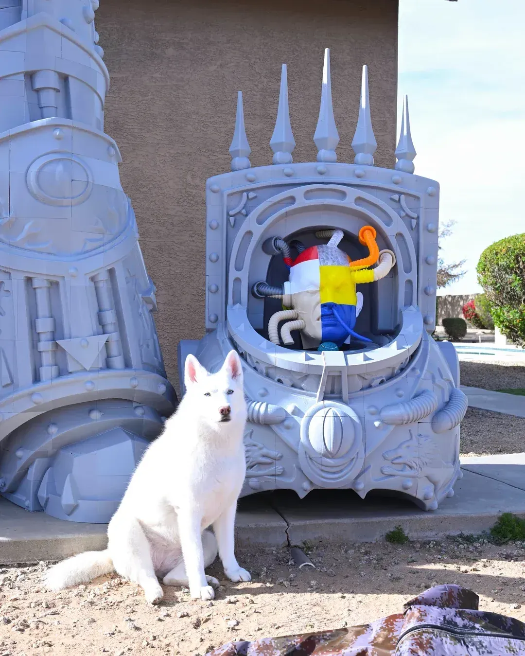 它眼巴巴地望着镜头,仿佛在控诉主人只顾着拼3D打印巨型手办而不陪它玩。