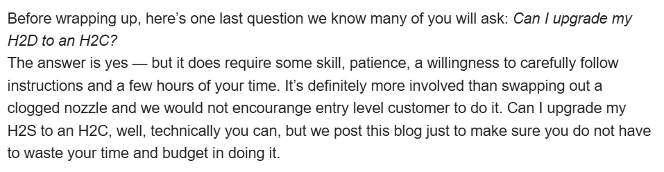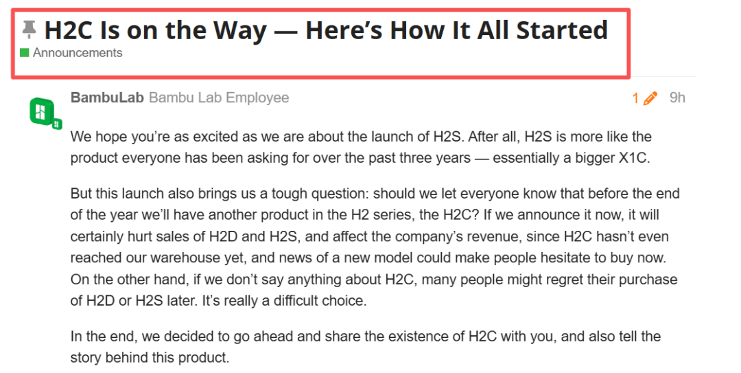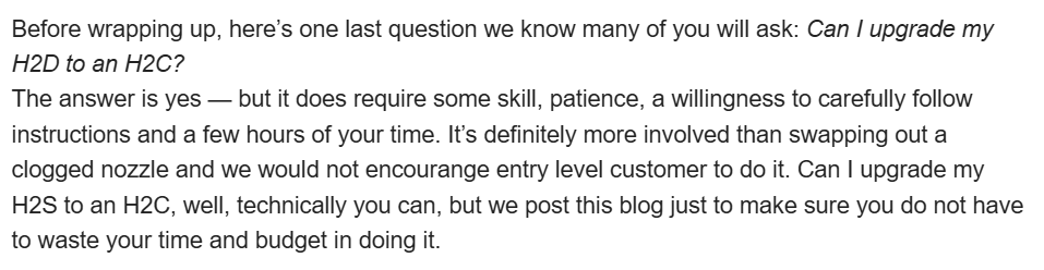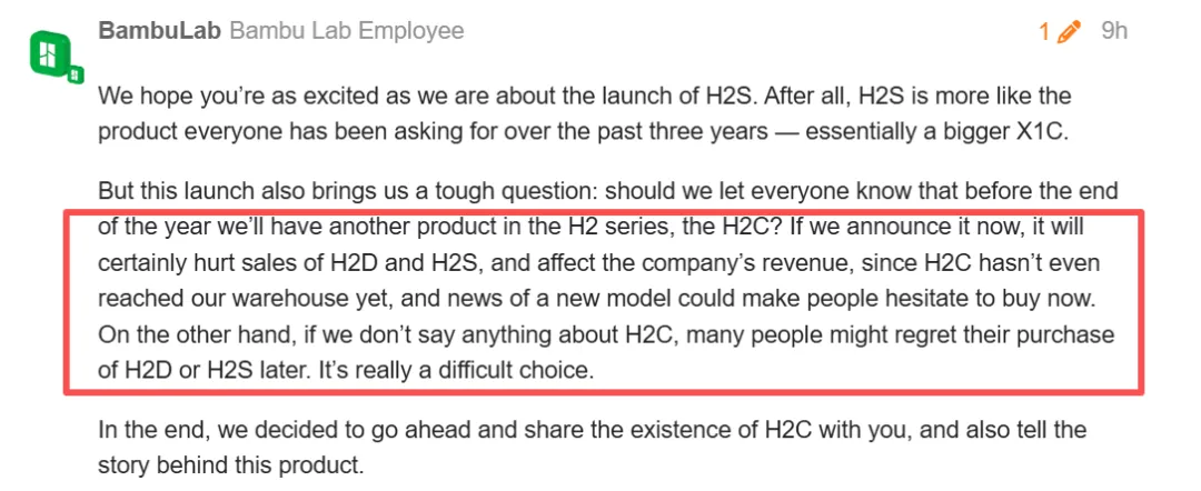 "但如果我们不说关于H2C的任何事情,许多人稍后可能会后悔购买H2D或H2S。"