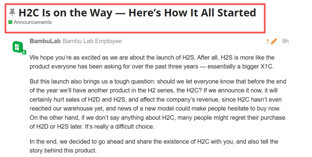 "如果我们现在宣布H2C,肯定会损害H2D和H2S的销售,并影响公司的收入。"