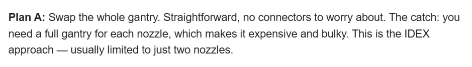 缺点是:你需要为每个喷嘴配备完整的龙门架,这使得成本高昂且体积庞大。这就是IDEX方法—通常限制在两个喷嘴。