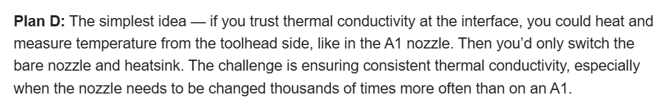 最简单的想法—如果你信任接口处的热传导性,你可以从工具头侧加热和测量温度,就像A1喷嘴一样。