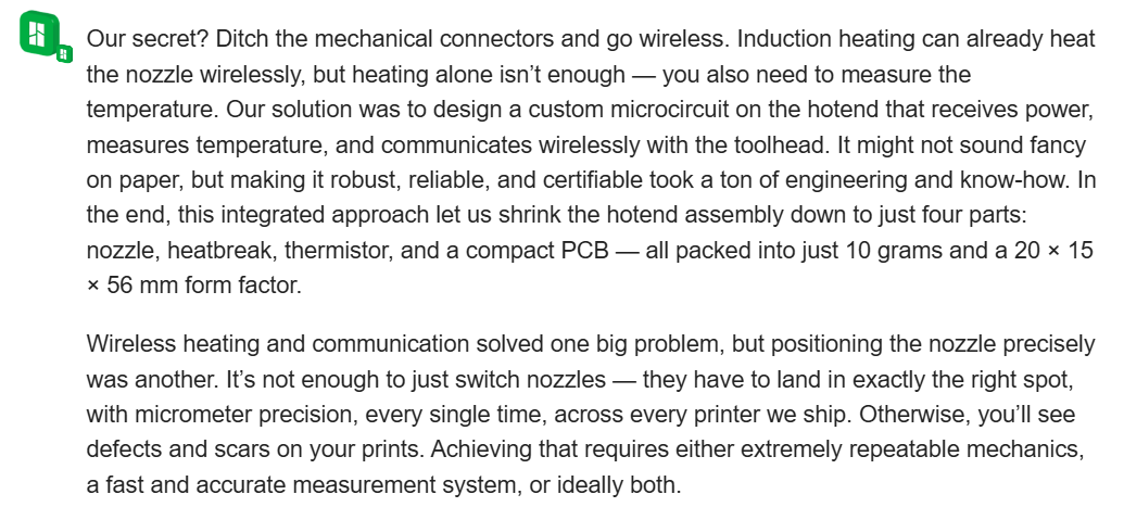 这些可切换热端没有任何可能随时间磨损的电缆或弹簧针,而是使用芯片与打印机无线通信并使用感应加热来加热喷嘴。