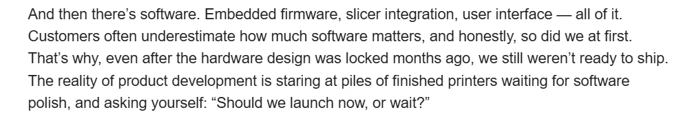 "客户经常低估软件的重要性,说实话,我们最初也是如此。这就是为什么,即使在硬件设计几个月前就锁定了,我们仍然没有准备好出货。"