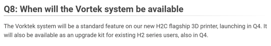 Vortek系统将作为新H2C旗舰3D打印机的标准功能,将在第四季度推出。