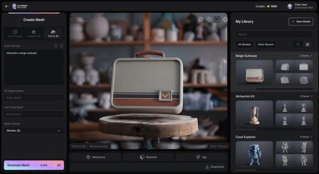 Wonder 3D搭载多个AI辅助工作流以加速前期资产开发:基于文本提示生成角色、生物或道具资产,图像转3D功能可将草图转化为带拓扑结构的3D模型,系统还集成了文本转图像模块。