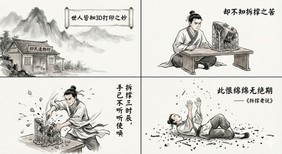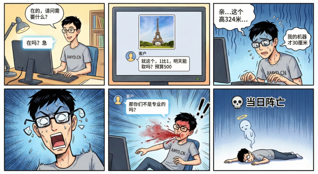 这些年,AM易道见过许多凌晨三点守着打印机的青年,见过被甲方需求逼疯的同行,也见过无数次就差一点点结果翻车的打印名场面。