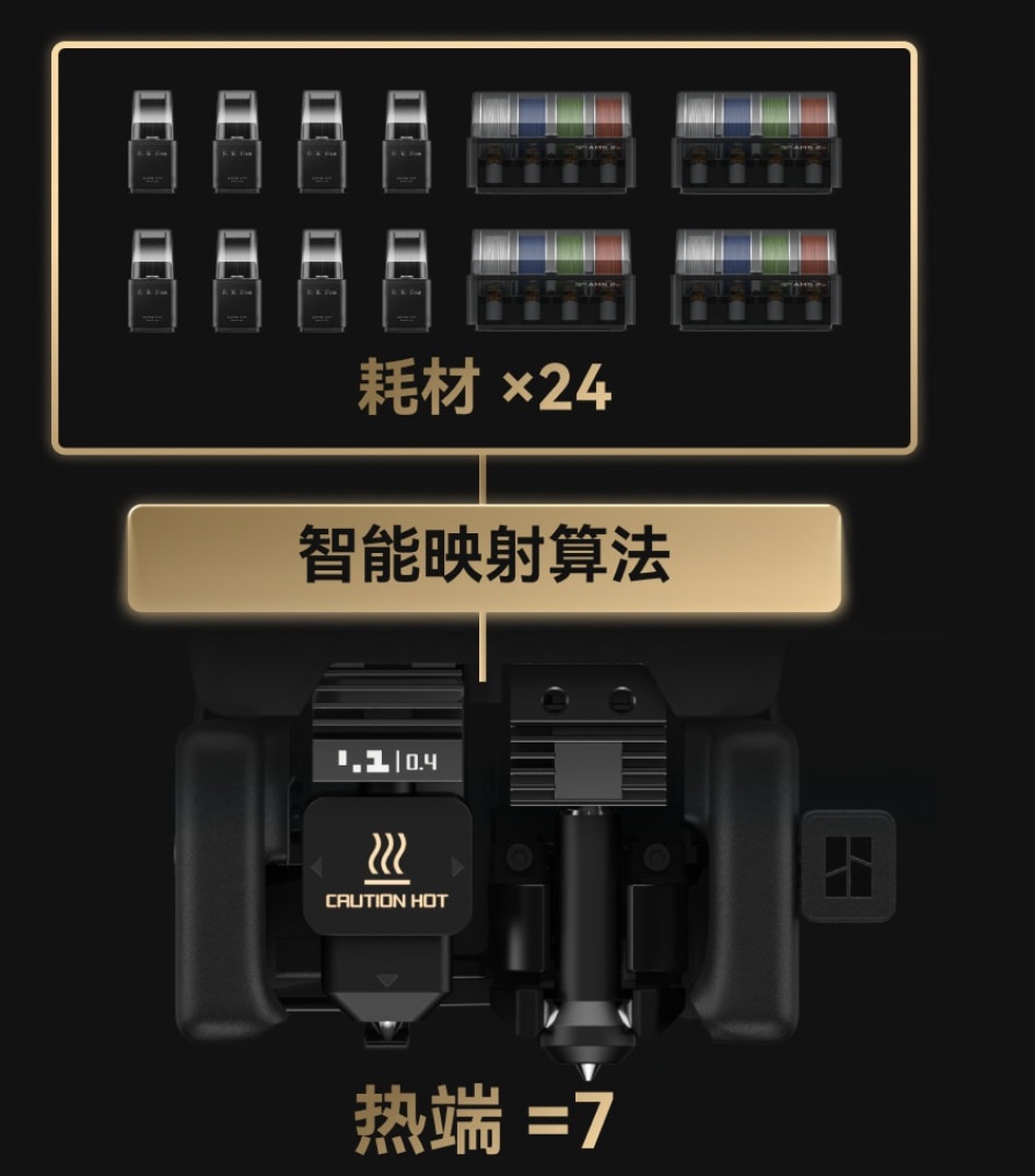 其智能算法可优化耗材与热端的分配,在减少冲刷废料的同时,也可实现出色的多色多材料打印效果。