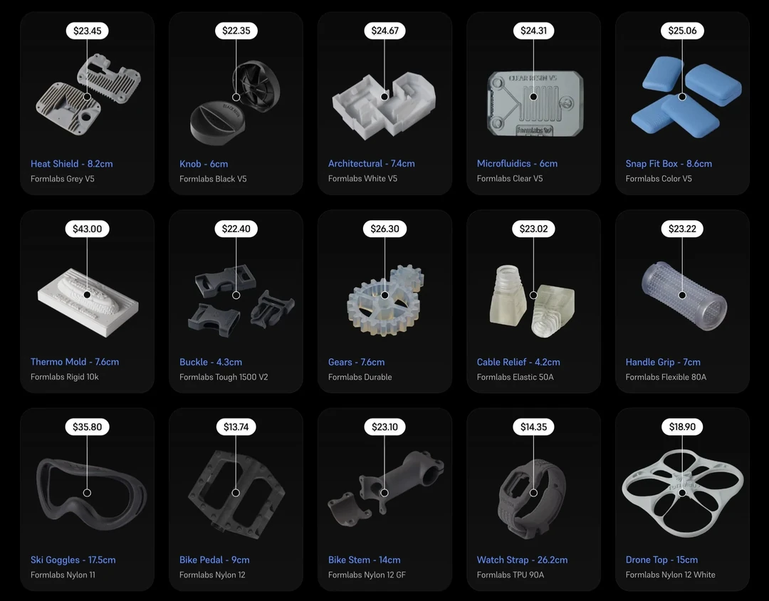 客户可以通过Form Now服务批量上传标准的STL和OBJ格式文件,并在结账时即时获取报价。为了满足多样化的机械与功能需求,该服务提供了一个庞大的材料库,总计包含超过15种适用于SLA和SLS工艺的材料。