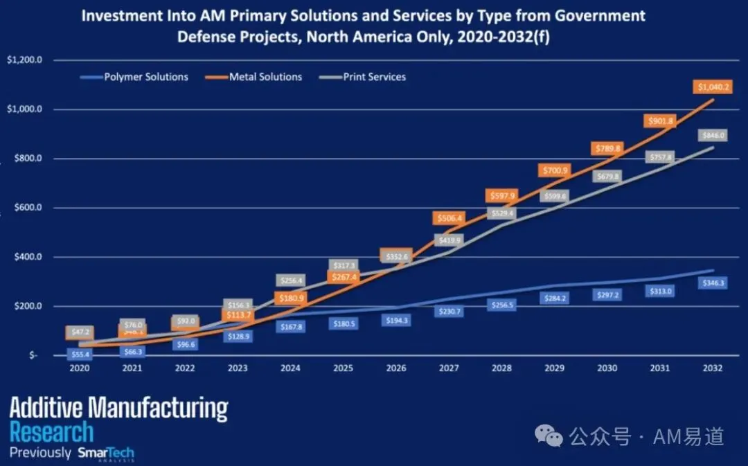 2023年11月,增材制造研究AMR公布了2020 年至 2032 年有关北美政府国防项目3D打印投资的数据。
