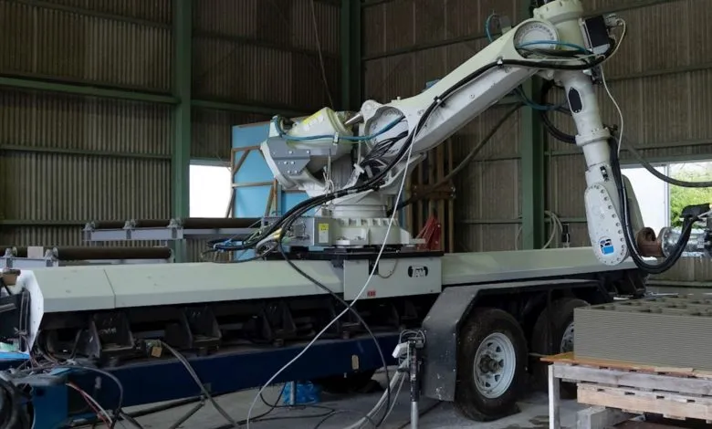 这些构件包括屋顶、后墙以及两个形成侧墙和地面的角部构件,打印材料为速凝砂浆,并在运往现场前完成了钢筋加固和混凝土浇筑。