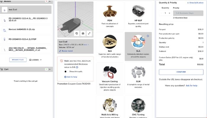 该平台推出基于人工智能的在线报价系统,可对比SLS、SLA、MJF、陶瓷打印和FDM等多种增材制造工艺的成本和性能。