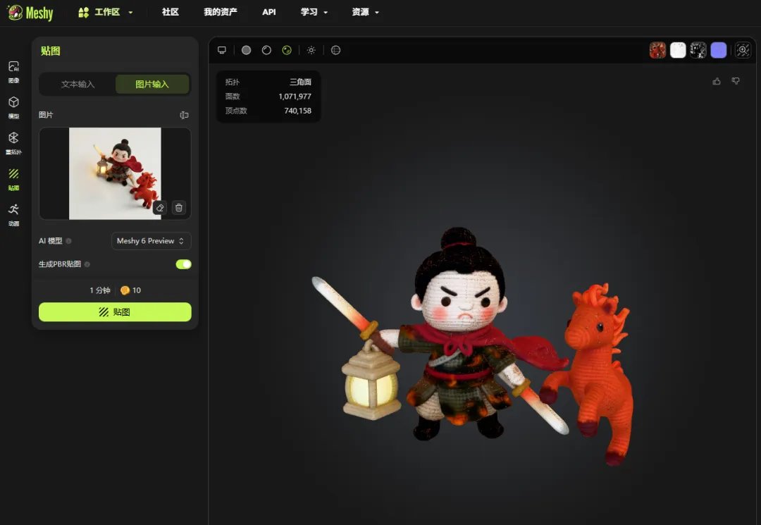 主图和三视图导入Meshy后分别生成的模型和赋予贴图: