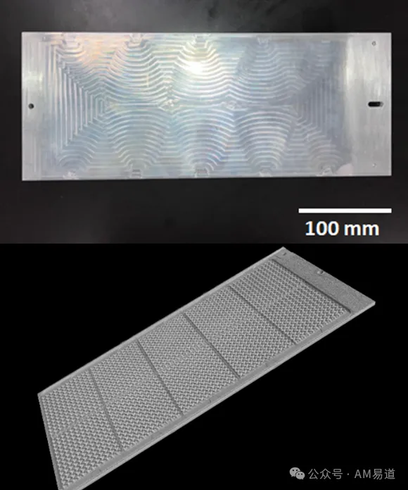 其还实现了大尺寸制造,展示了外形尺寸达400 x 160 x 10mm的大型冷却组件,内部整合了10个BJT制造的螺旋翅片结构。