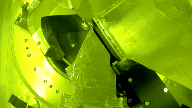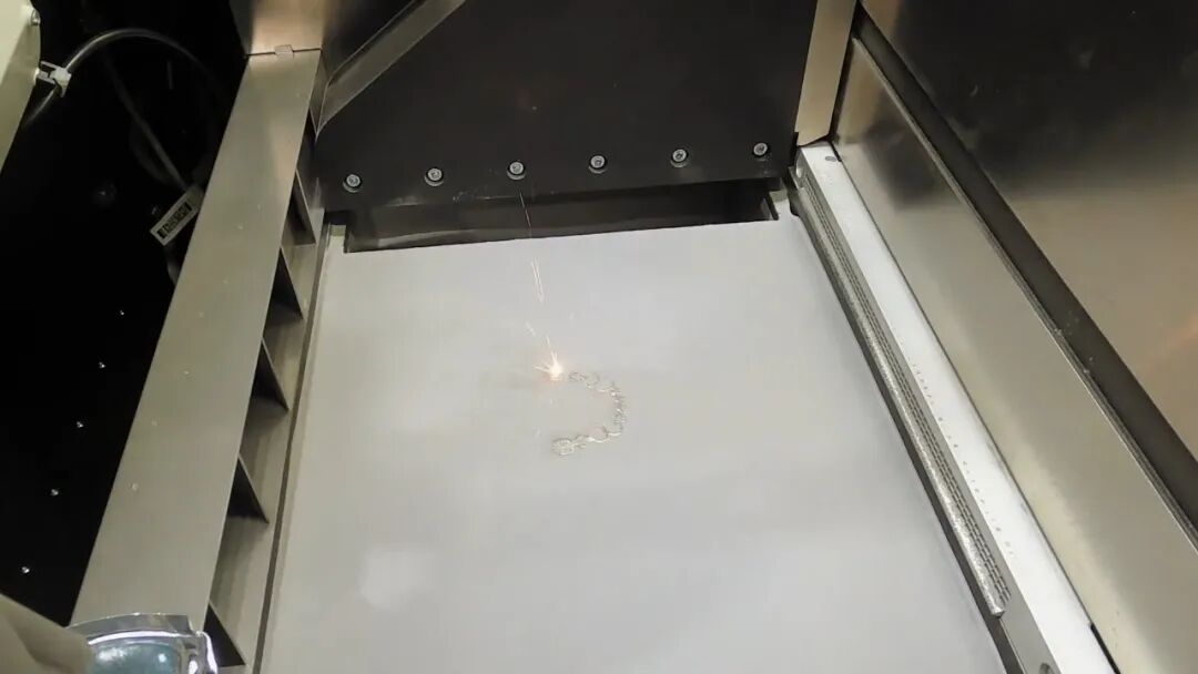 送粉器、激光束和惰性气体保护喷嘴被固定在特定的位置,而打印件所在的平台则在下方持续旋转。
