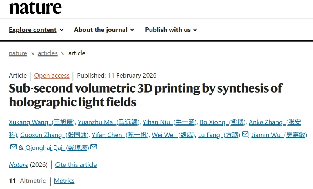 2026年2月11日,清华大学戴琼海院士团队在Nature上发了一篇论文,提出了一种叫DISH的体积3D打印新方法。