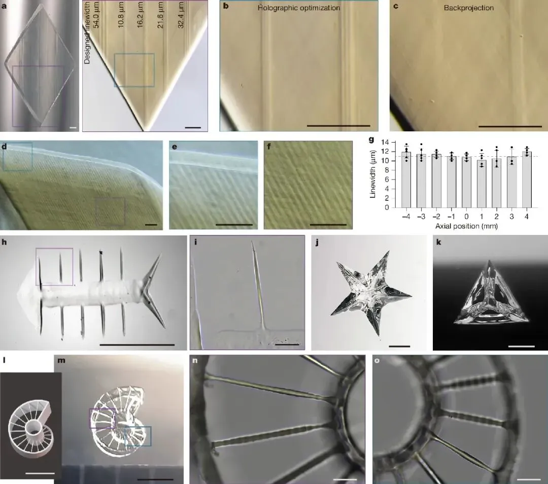 最能说明整体打印能力的是海螺模型(Fig. 4l-o),它包含沿不同方向、不同轴向位置分布的线条,相当于对全三维空间打印均匀性的综合考试,实测线宽19.3±3.4微米。