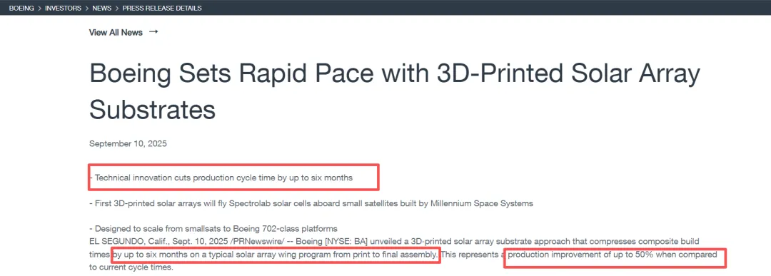 波音将典型太阳能阵列翼从打印到最终组装的时间缩短了多达6个月,生产效率提升50%。