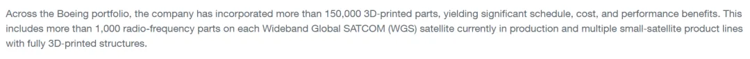 波音已经在其产品组合中安装了超过15万个3D打印零件,包括目前生产的每颗宽带全球卫星通信军用卫星上超过1000个射频组件,以及多个小卫星产品线的完整结构。