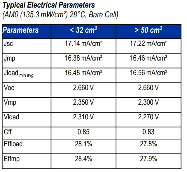 Spectrolab提供一系列GaInP/GaAs/Ge晶格匹配的三结太阳能电池,效率高达32%。