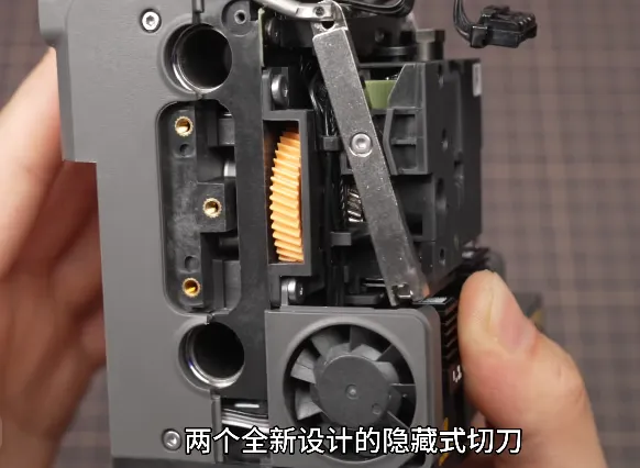 X2D的工具头里塞了两个标准热端、两把隐藏式切刀,加上一套纯机械结构驱动的喷嘴切换系统,整体尺寸跟P2S几乎一模一样。