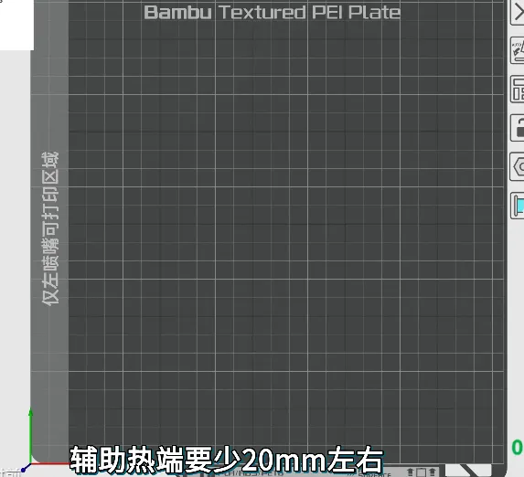 辅助热端的打印范围比主热端少约20mm左侧空间,切片时把需要辅助喷嘴承担的区域往右摆,才能用满打印尺寸。