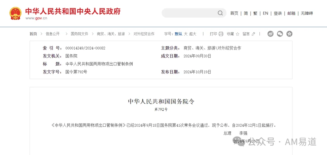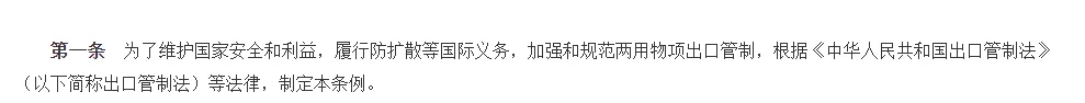 就在刚刚!国务院发布《中华人民共和国两用物项出口管制条例》(以下简称《条例》),将于2024年12月1日起正式实施。