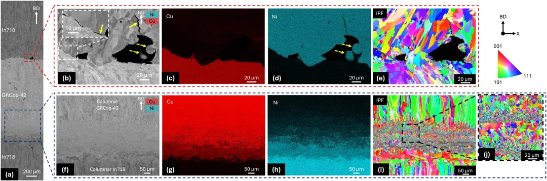 题图显示了水平IN718/GRCop-42界面的背散射和成分分析,展示了未熔合缺陷和晶粒细化行为。图片来自 Bulloch 等人,《增材制造快报》。