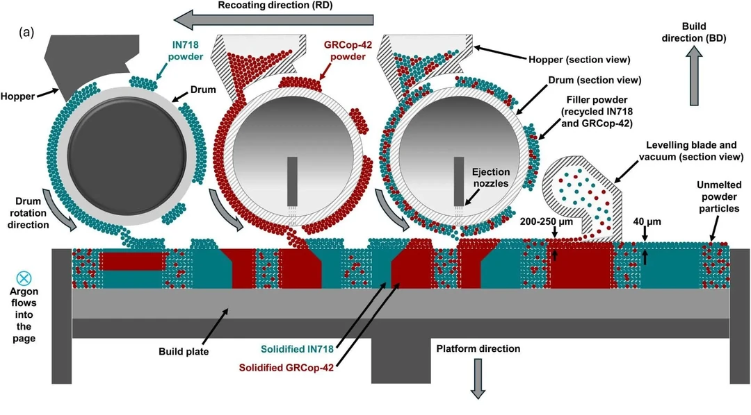 这项工作的重点在于诸如火箭燃烧室等部件,其中IN718提供高温强度,而GRCop-42——一种由NASA开发的Cu-Cr-Nb合金——则增强散热能力。