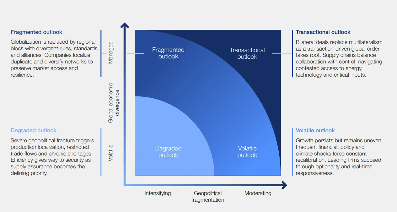 这份题为《2026年全球价值链展望:协同企业与国家敏捷性》的报告,主要与咨询公司科尔尼合作编写,并吸纳了超过100位行业和政府领导人的意见以及300多位全球高管的调查数据。报告聚焦于企业和政府应如何应对由地缘政治紧张局势、贸易碎片化和资源限制所驱动的“结构性波动”。