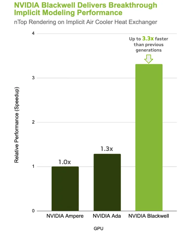 英伟达最新Blackwell架构在nTop隐式建模上的速度,相比上一代GPU有显著提升。
