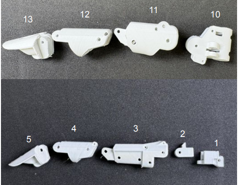 以中指的掌指关节为例,整个关节采用模块化设计,可以独立打印后再组装,即使打印失败也只需要重打单个零件。