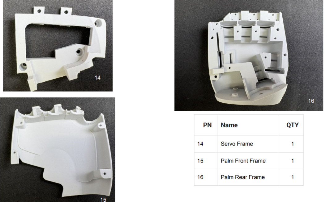 根据GitHub上的开源文件,整个机械手需要打印约50个零件。